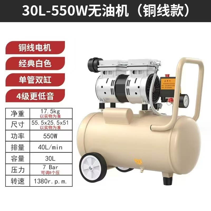 目前的静音无油压缩机主机均采用微型往复活塞式压缩机,其工作原理:电机单轴驱动压缩机曲轴旋转时,通过连杆的传动,具有自润滑而不添加任何润滑剂的活塞做往复运动,由气缸内壁、气缸盖和活塞顶面所构成的工作容积会发生周期性变化。活塞从气缸盖处开始运动时,气缸内的工作容积逐渐增大,这时,气体即沿着进气管,推开进气阀而进入气缸,直到工作容积变到更大时为止,进气阀关闭;活塞式压缩机的活塞反向运动时,气缸内工作窨积缩小,气体压力升高,当气缸内压力达到并略高于排气压力时,排气阀打开,气体排出气缸,直到活塞运动到极限位置为止,排气阀关闭。