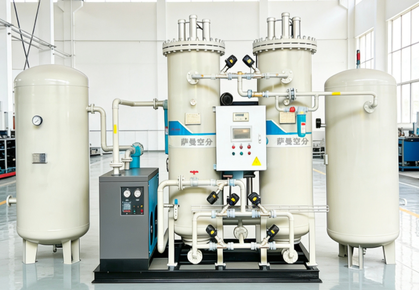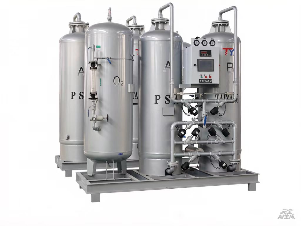 变压吸附制氧装置以洁净的压缩空气为原料,采用高品质的沸石分子筛作为吸附剂,在一定的压力下,从空气中制取氧气。经过纯化干燥的压缩空气,在吸附器中进行加压吸附、减压脱附。由于空气动力学效应,氮在沸石分子筛微孔中扩散速率远大于氧,氮被沸石分子筛优先吸附,氧在气相中被富集起来,形成成品氧气。然后经减压至常压,吸附剂脱附所吸附的氮气等杂质,实现再生。一般在系统中设置两个吸附塔,一塔吸附产氧,另一塔脱附再生,通过PLC程序控制器控制气动阀的启闭,使两塔交替循环,从而取得纯度较高的氧气(93%±3%)。